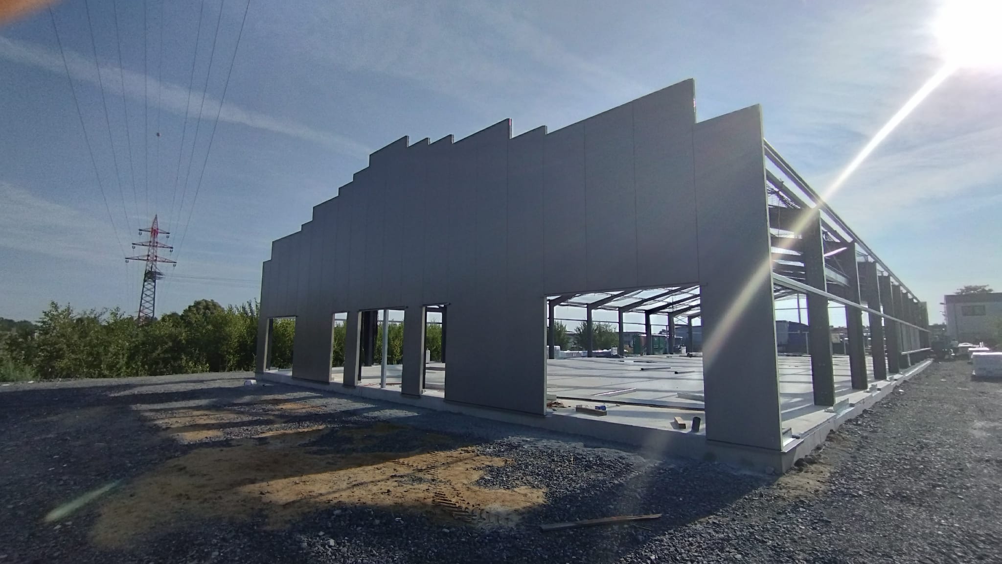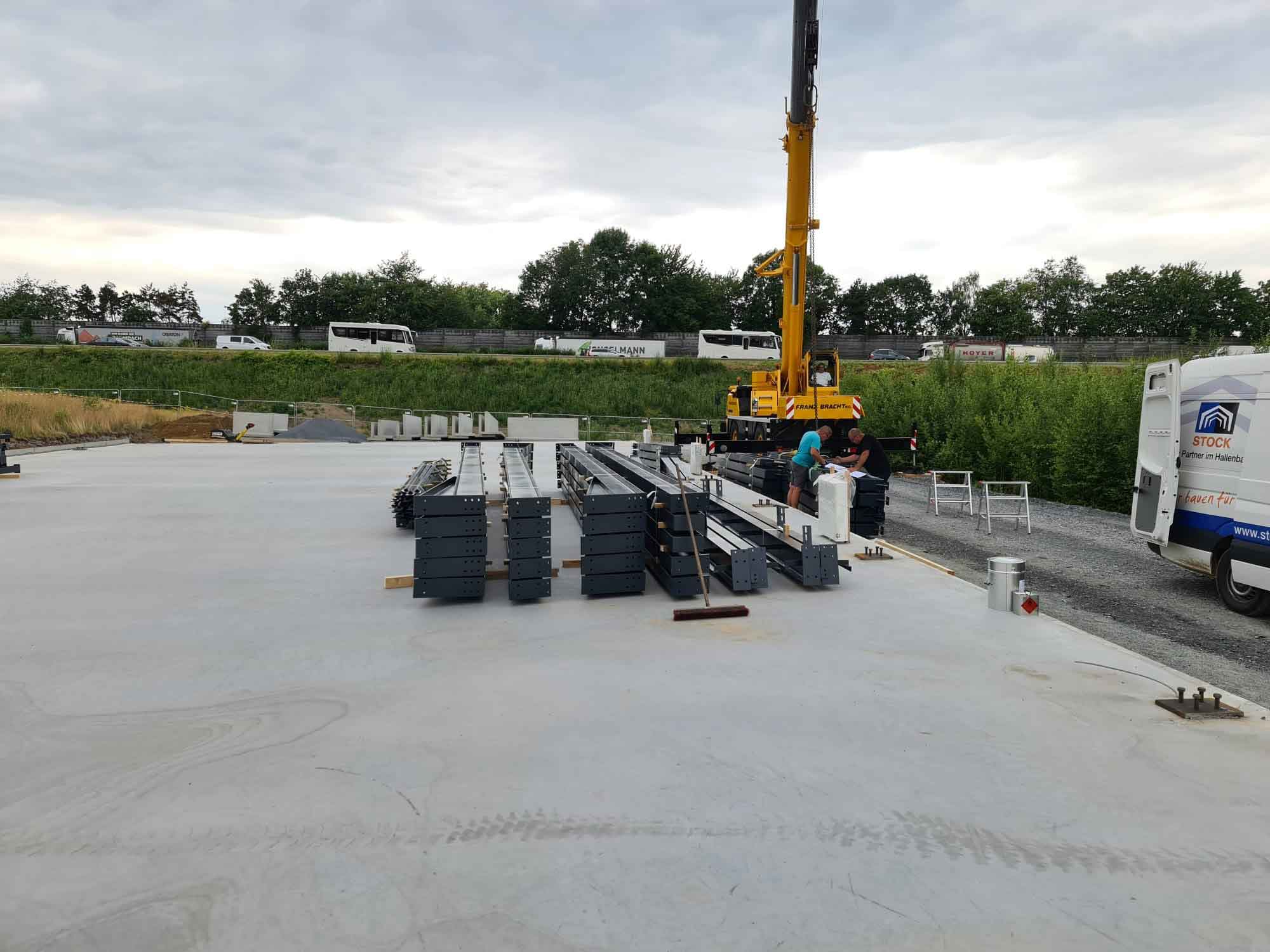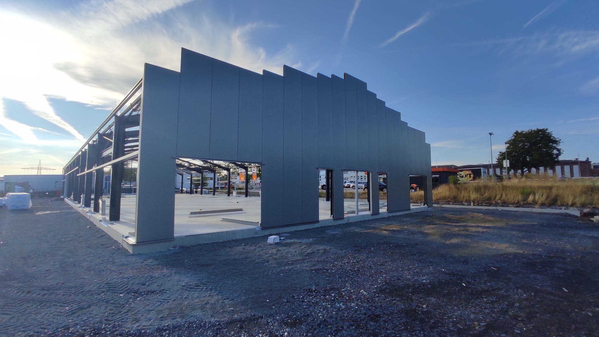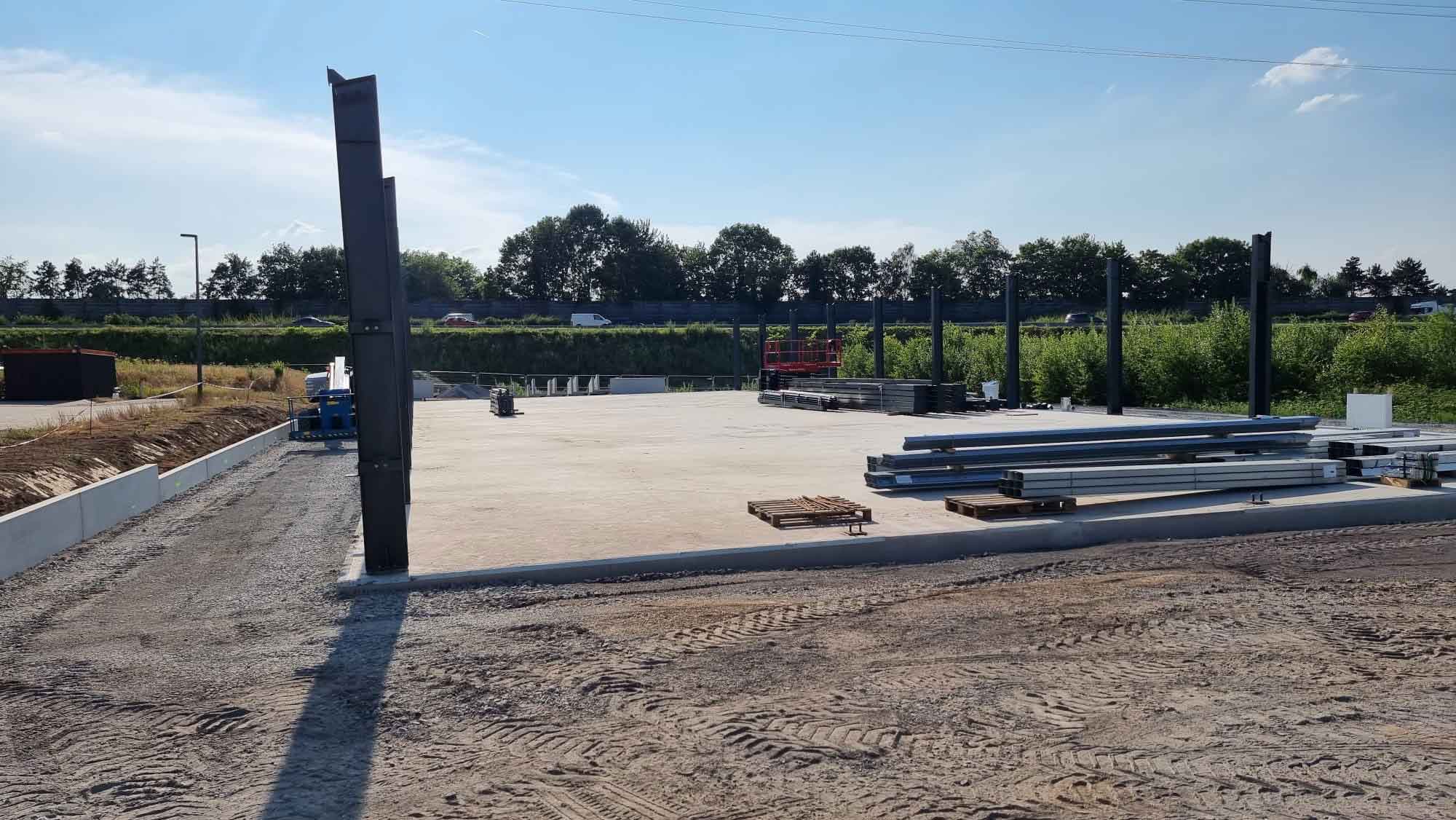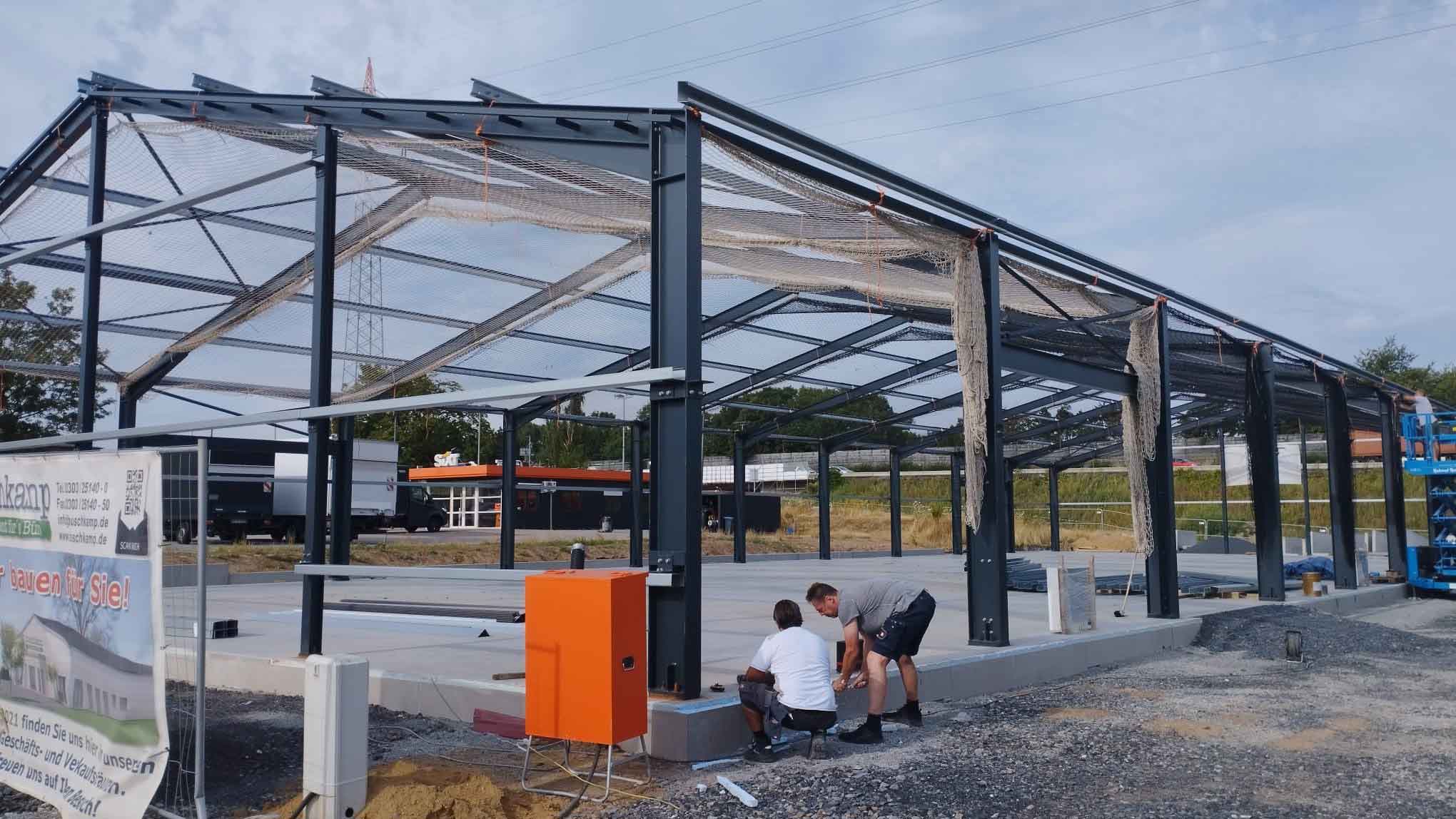 Langsam ist es als Halle erkennbar.Ab der 30. KW fangen die Monteure mit der Wand- und Dachverkleidung an.