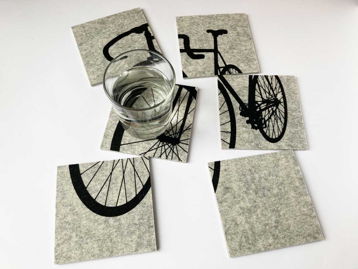 aus 100 % Wollfilz handbedruckt mit schwarzem Rennrad-Motiv. Ein perfektes Geschenk für Fahrrad-Fans und Küchen-Accessoire für Velo-Begeisterte! Einzeln hingelegt eignen sich die Untersetzer perfekt für Gläser. Witzig dabei: Wie bei einem Puzzle zeigt jeder Untersetzer nur einen Ausschnitt des Motivs. Zusammengfügt bieten die Untersetzer eine ideale Abstellmöglichkeit für Töpfe und Auflaufformen.