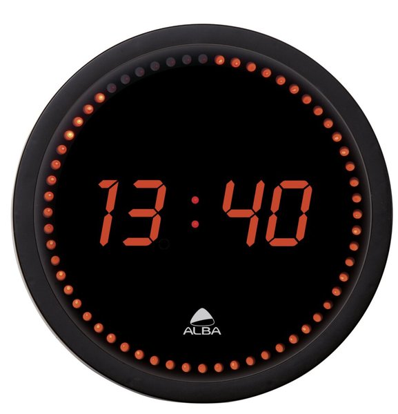 Diese digitale LED Wanduhr fällt auf.Farbe: schwarz mit digitaler Zeitanzeige in rotDisplayanzeige in Stunden und Minuten, zählen von Sekunden rund um das ZifferblattMaterial: Gehäuse aus KunststoffAbdeckung aus GlasBatteriebetrieb:Durchmesser: 30 cmLieferung inkl. Netzadapter