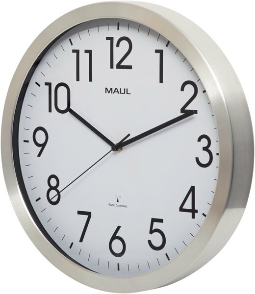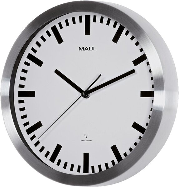 Funkuhr, Ø 30,5 cm, im eleganten, klassischen Design aus gebürstetem Aluminium mit einer Abdeckung aus Mineralglas.Automatische Synchronisation mit dem DCF77-Signal