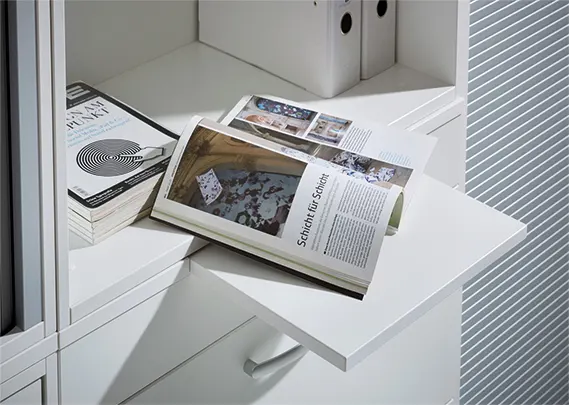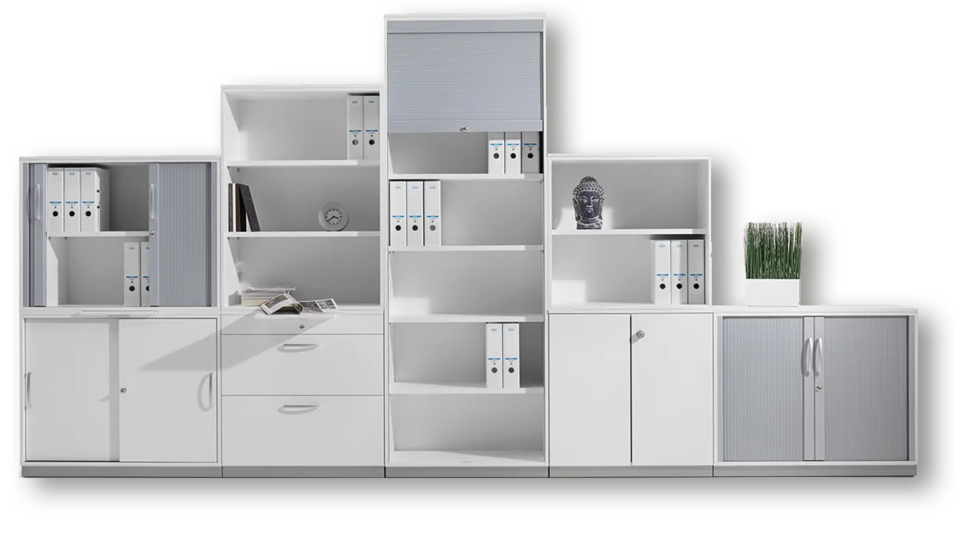 Schaffen Sie Struktur – mit unseren Büroschränken Die modularen Schränke sind flexibel kombinierbar und erweiterbar. Ob freistehend oder an der Wand, bieten sie dank intelligenter Innenaufteilung vielfältige Nutzungsmöglichkeiten. Optisch überzeugen sie durch eine breite Auswahl an Ausführungen und Oberflächen, von Grautönen bis zu Holz- und Feelwood-Dekoren. Durchdachtes Zubehör sorgt für effektive Stauraumnutzung und ermöglicht eine bedarfsgerechte Büro-Einrichtung.